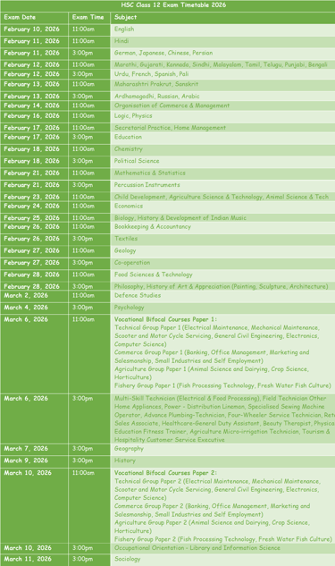 The Maharashtra State Board of Secondary and Higher Secondary Education (MSBSHSE) has released the tentative HSC timetable 2026 for all streams — Science, Commerce, and Arts.