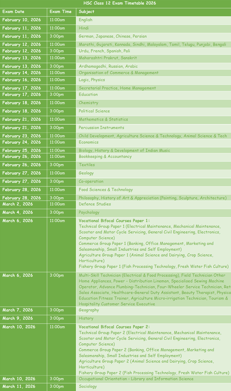 Here’s the tentative date and subject-wise HSC Class 12 Board Exam Timetable 2026 for your quick reference: